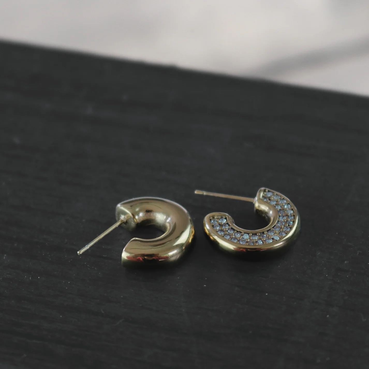 Joy Clear CZ hoop earrings embellished with cubic zirconia are the perfect way to add a luxurious trendy look to your style. They have a unique design on one side.